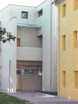 Nel nuovo edificio si trovano gli alloggi e due negozi, uno dei quali è adibito a centro di ritrovo per persone anziane (in una delle foto, l’interno del centro; nelle altre, l’edificio verso la piazza un suo particolare). Sei appartamenti si sviluppano su due piani, il primo e il secondo, con vista sul canale Piavon e superfici variabili da 51 a 54 metri quadrati. Tutti sono composti da ingresso, soggiorno con zona cottura, camera, servizi. Gli altri due appartamenti si sviluppano sul solo primo piano, con vista sulla nuova piazza. Uno di essi è di 58 metri quadrati, con ingresso, soggiorno, cucina, due camere da letto, servizi, disbrigo; l’altro è un “mini” da 45 metri quadrati. All’ultimo piano del vano scala è stata ricavata una terrazza-stenditoio. Vicino al nuovo fabbricato dell’Ater c’è un edificio sottoposto a radicale restauro. Al piano terra, di 98 metri quadrati, sono stati ricavati quattro ambulatori e locali di servizio per le esigenze dell’Ulss nel Comune; al primo piano, di 92 metri quadrati, quattro uffici e locali di servizio; al secondo piano un archivio di 62 metri quadrati nel sottotetto e ulteriori 22 metri quadrati di locali di servizio. A collegamento tra il nuovo fabbricato Ater e l’edificio restaurato è stato realizzato un nuovo tratto vetrato con vano scala e funzioni distributive. Nel lato est del complesso è stato realizzato un garage per tre posti auto (già ceduti). Infine è stata realizzata una grande piazza centrale con porticato lungo via Roma.